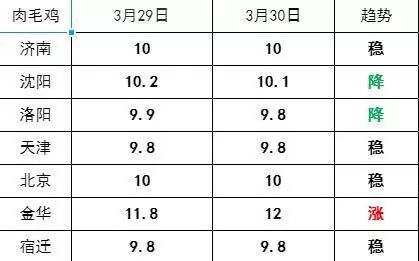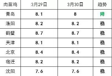 3月30日生猪价格与昨日相比整体来看依旧是偏向稳定的,个别地区有小涨。肉鸡价格稳定在多数,个别地区上涨,鸡苗价格基本稳定。
