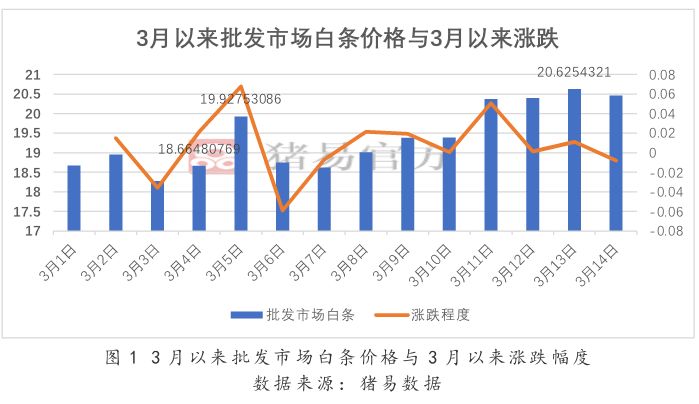 从图1可以看出,3月之后白条价格出现两次明显上调,第一次为3月5日,上调幅度达到1.3元,而当时消费终端正值节后疲软阶段,短暂上调之后销量下降,这迫使屠宰厂再次回调白条售价。然而8-10日白条价格再次上涨,涨幅趋于平缓,一直到3月13日白条价格达到20.6元,但很快3月14日则再次向下调整。